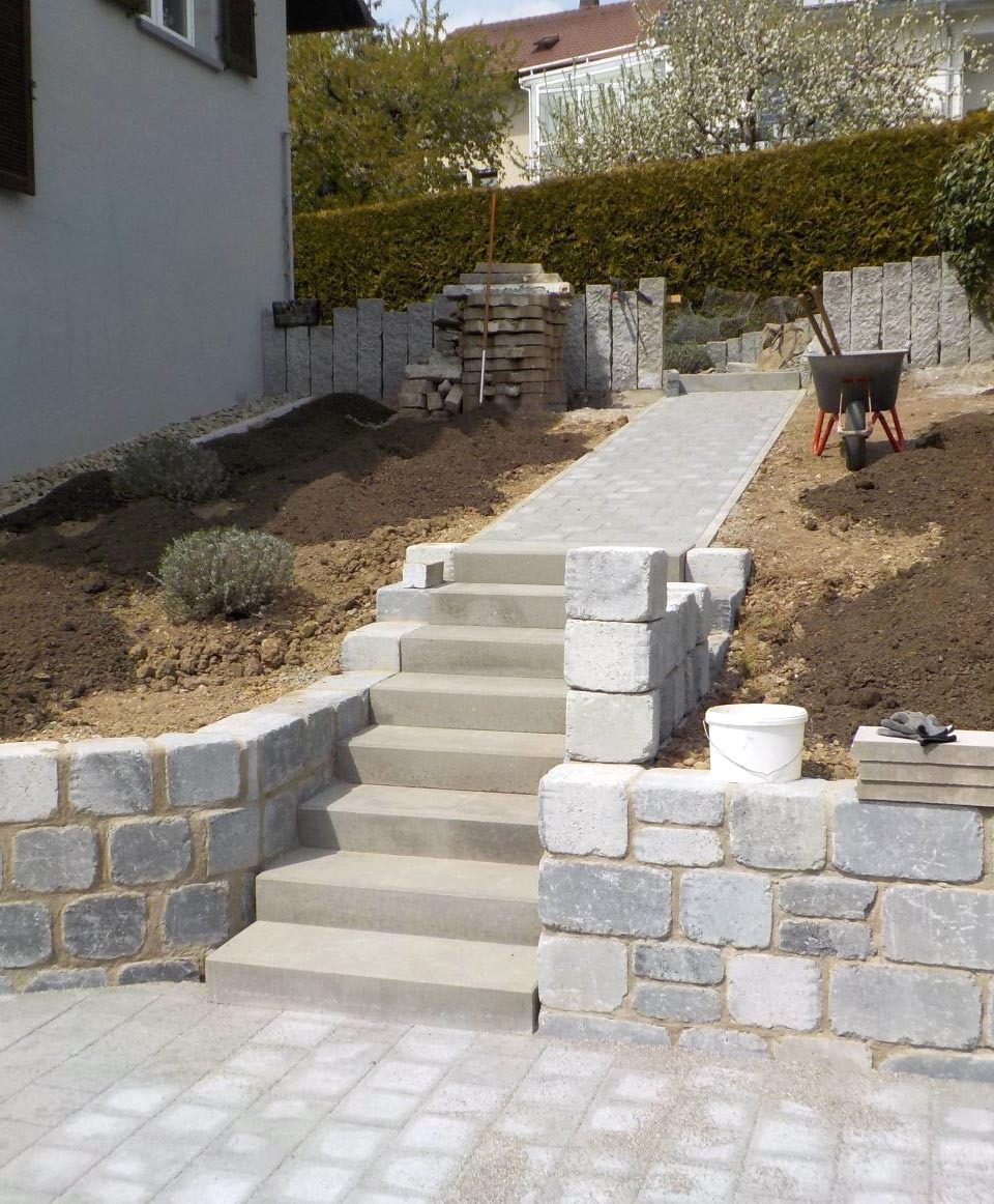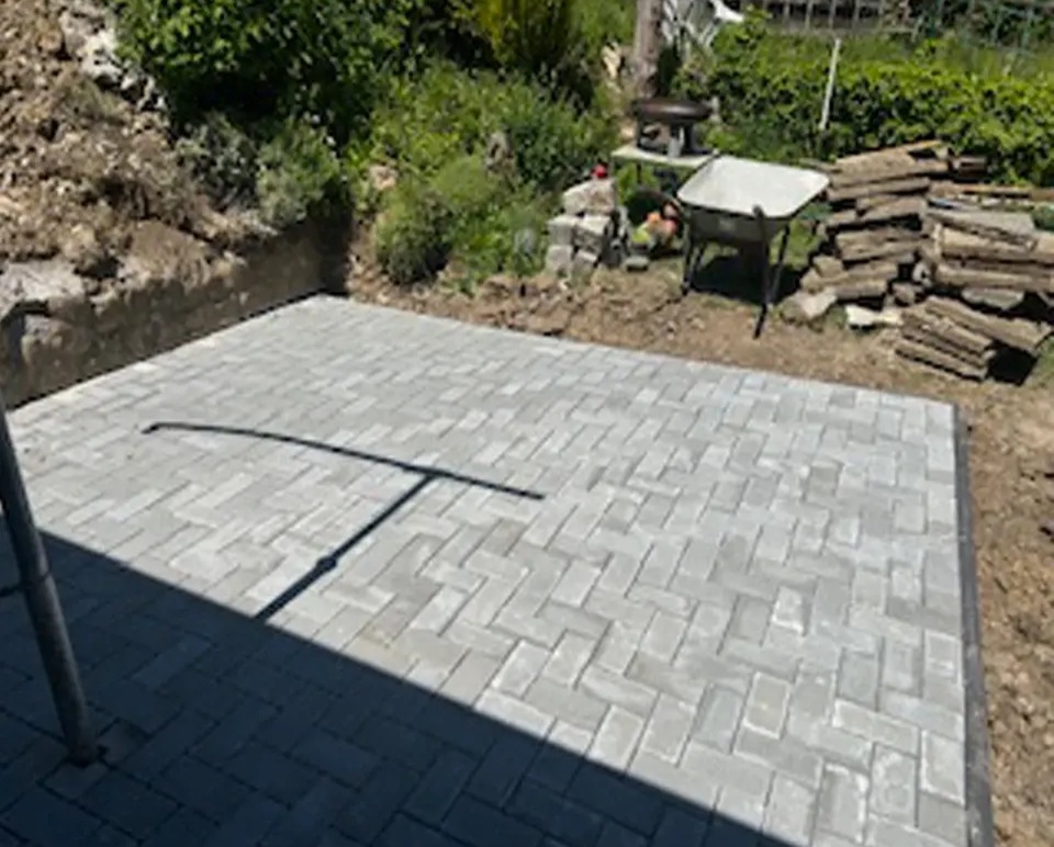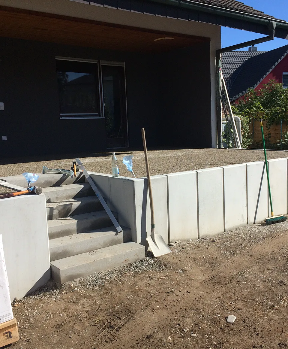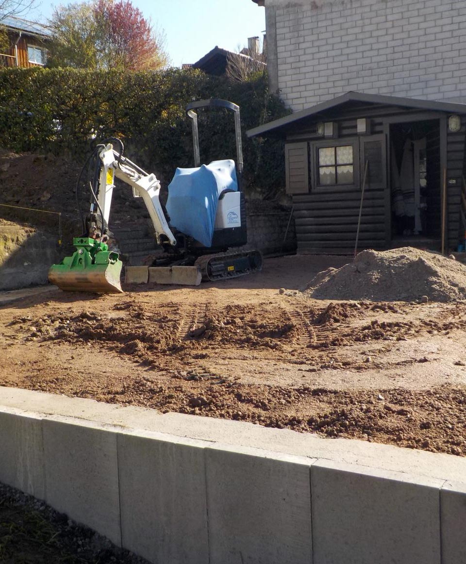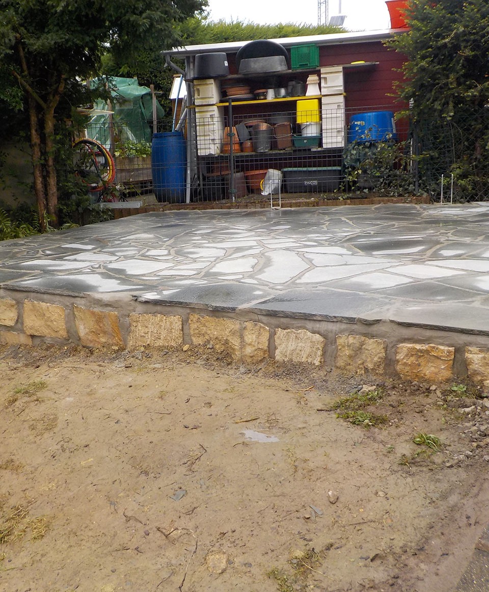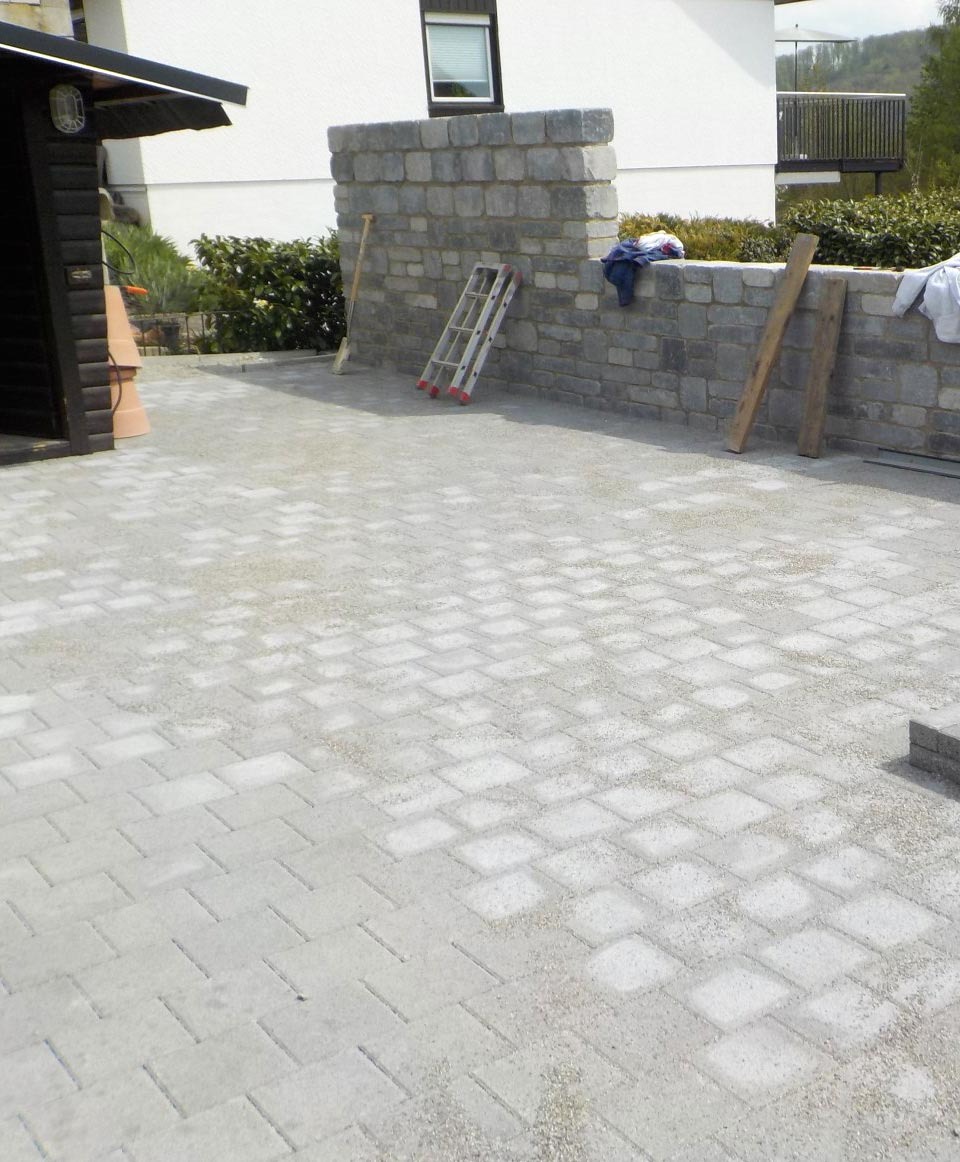 Für unseren Kunden in Hauingen haben wir eine neue Terrasse mit umgebender Mauer und gepflastertem Boden angelegt. Sämtliche nötige Arbeiten wie Erdarbeiten, das Anlegen des Fundaments und der Randsteine, Mauer- und Treppenbau und die Pflasterung wurden von uns ausgeführt.