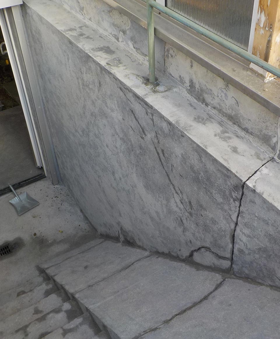 Bei der von uns vorgeschlagenen Sanierungsmaßnahme wurden die Belastungsrisse mit einer elastischen Dichtmasse injiziert, verankert und verputzt. So erreichte die Treppe wieder ihre ursprüngliche Festigkeit.