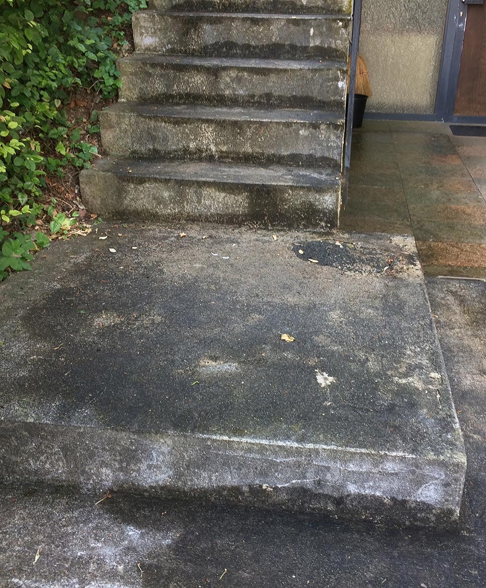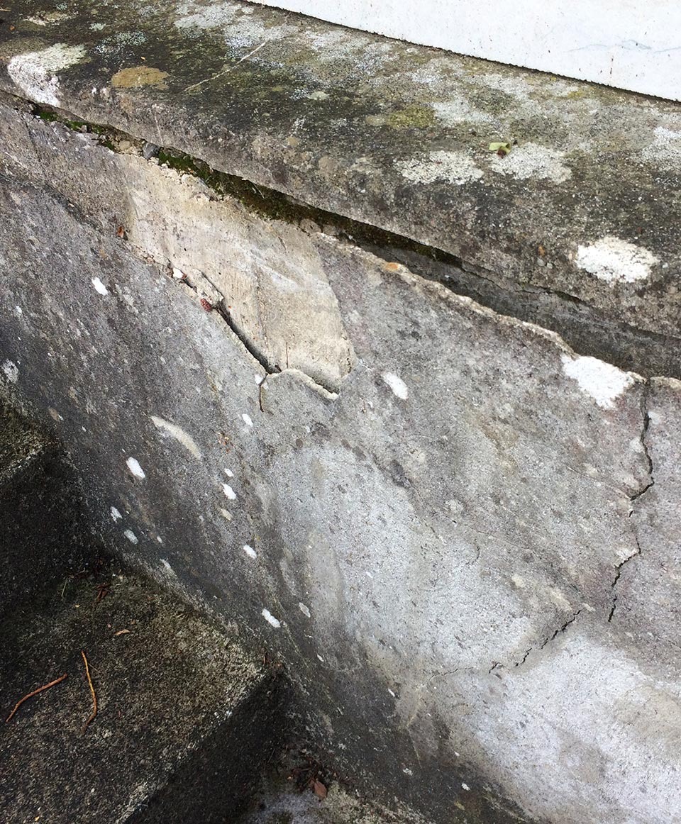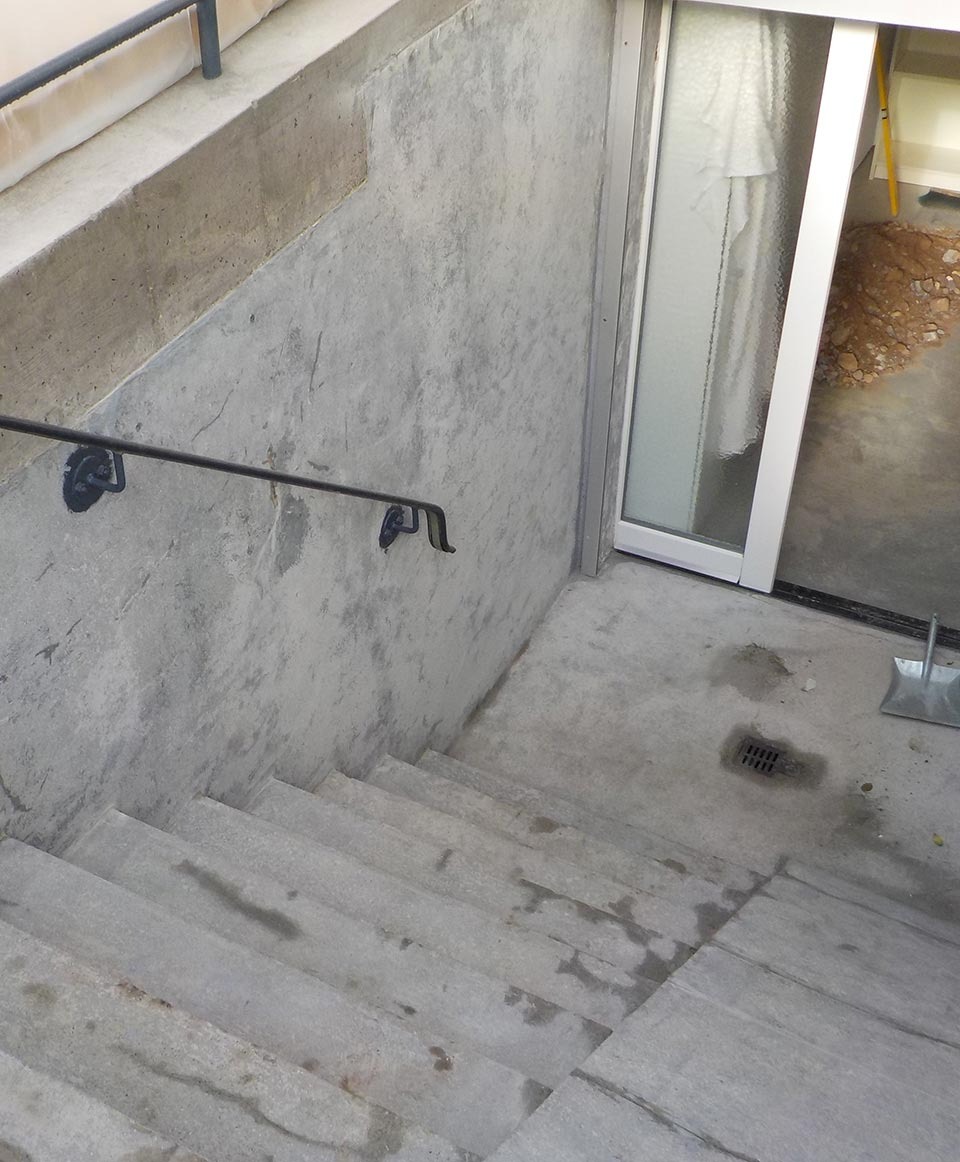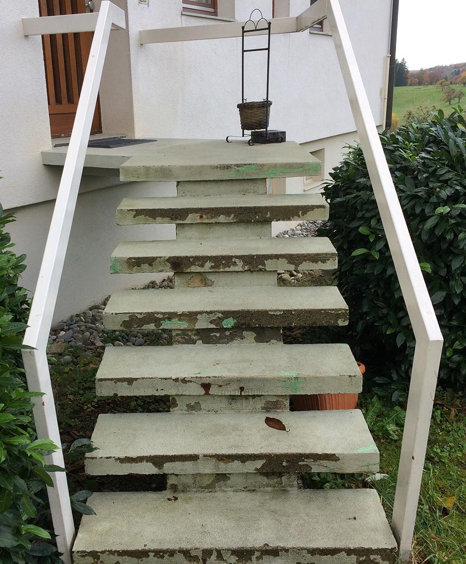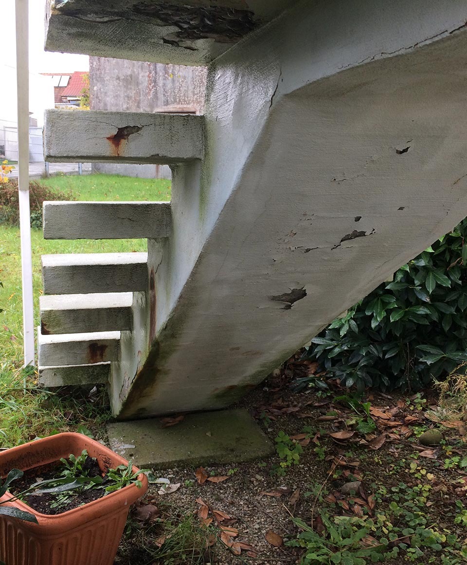 Der Beton der Treppe hatte durch Risse aufgrund jahrelanger Dauerbelastung seine Festigkeit verloren. Die Treppenbeläge und der Putz lösten sich und es kam zu Frostabplatzungen.