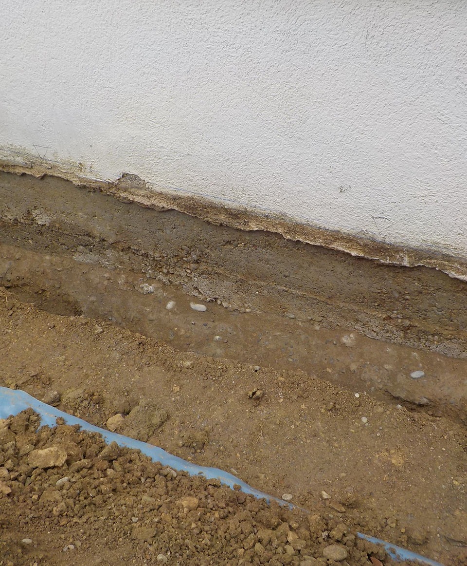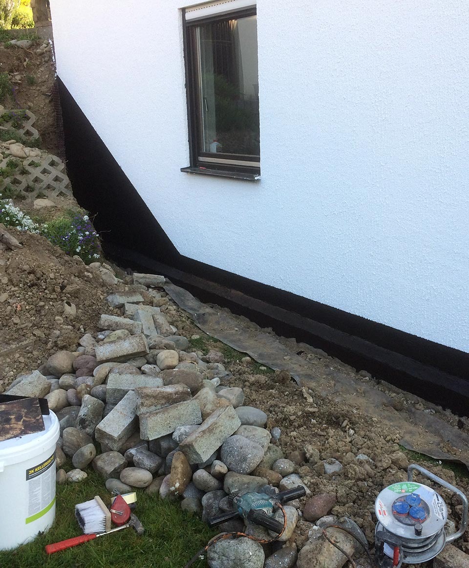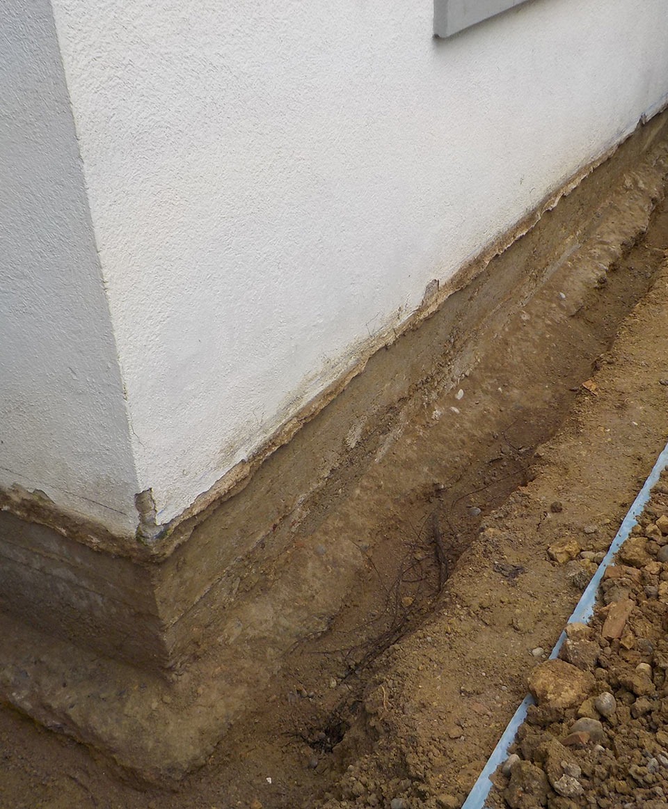 Die Kellerwand wurde dabei zunächst entlang der Fundamentmauer ausgegraben. Der zuvor undichte Übergang von Boden zur Wand wurde mit einer geeigneten Technik fachgerecht abgedichtet und schützt nun langfristig vor erneuten Feuchtigkeitsschäden.